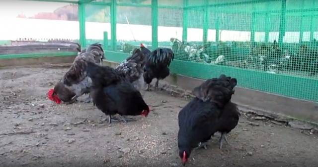 A szállás és a madárház elrendezése, valamint a Jersey csirkék etetése a videón látható.