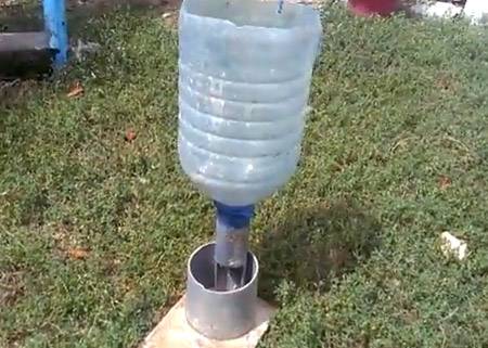 - Távolítsa el a műanyag palack alját. Helyezze az üveg nyakát a kisebb csőbe (azon az oldalon, amelyről nem vágták ki). A nyak és a cső érintkezésének helyét elektromos szalaggal kell becsomagolni.