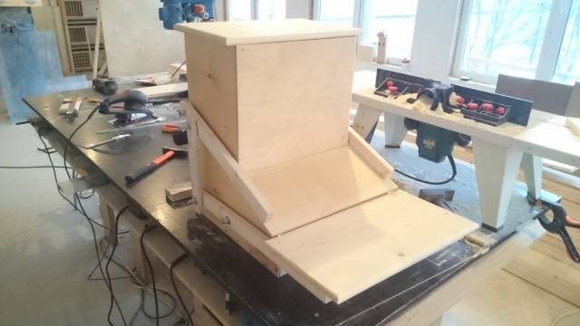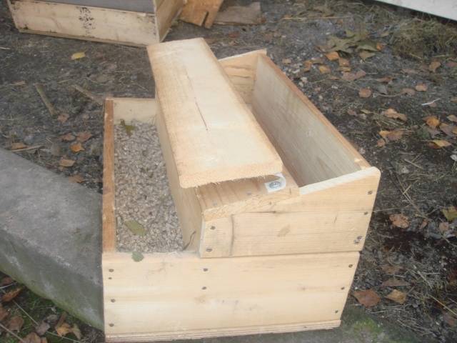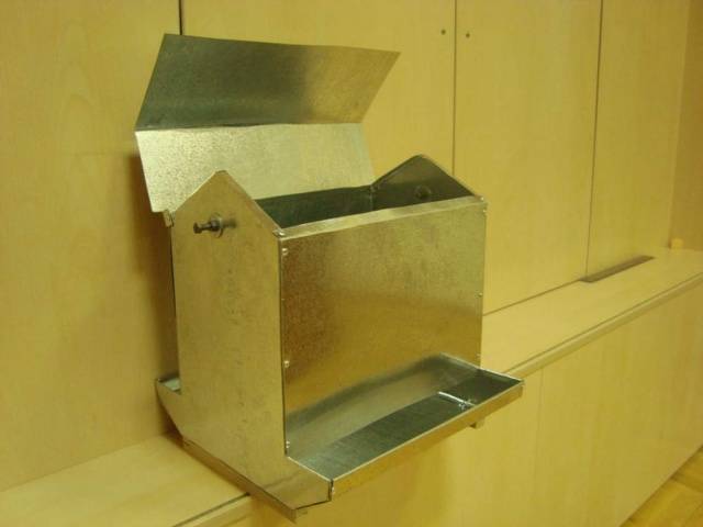 Ez a kialakítás stabilabb, mint például a műanyagból készült adagoló. A legegyszerűbb módszer: táblákból vagy rétegelt lemezekből összeállítani a tartályt, ahonnan a pulykák megeszik, és a "bunkert", amelybe a takarmányt öntik. A "bunker" felülről szélesebbnek, alul keskenyebbnek kell lennie, mint egy tölcsér. Ezután a "garat" a vályú falaihoz van rögzítve. Maga a szerkezet vagy lábakon készül, vagy a ház függőleges felületéhez van rögzítve.