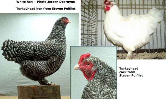 A fej közepes méretű, kicsi, általában lombgerincű. A gerincen lévő fogak száma 4 és 6 között változik. A szem narancsvörös. A fülbevalók és karéjak élénkpirosak, hosszúkák, közepes méretűek. Az arc vörös. A csőr rövid. A csőr színe világos, lehet fehér is.