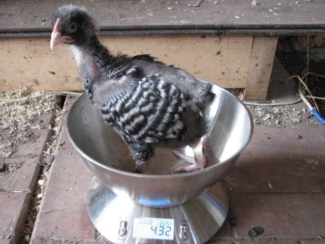A kakasok gyorsan híznak, és négy hónap múlva a kibelezett tetem nyak és láb nélkül 2,2 kg. Ennek megfelelően egy négy hónapos kakas élősúlya meghaladja a 3 kg-ot. A málna tulajdonosai szerint egy 9 hónapos kakas akár a 6 kg-ot is meghaladhatja. De ez azokból származik, akiket hízlalásra válogattak, nem pedig a törzs számára.