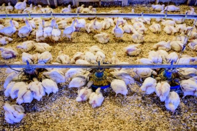 Az összehasonlító fotó azt mutatja, hogy ugyanazon a területen lényegesen kevesebb színes csirke van, mint a hagyományos brojlereknél.