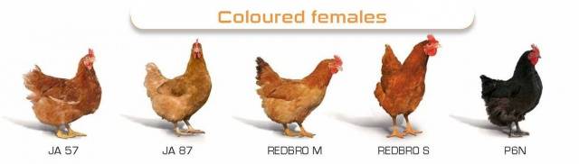 Ugyanakkor a Hubbard laboratórium, amely ipari kereszteket fejleszt a nagy baromfitartó telepek számára, háromféle redbro-t kínál eladásra: JA57 KI, M és S, amelyek kissé eltérnek egymástól termelési jellemzőikben. Ez nem a fajtákra jellemző, hanem az ipari keresztezésekre. A weboldalon bemutatott redbro laboratóriumok csirkefajták, amelyek leírása egyértelműen jelzi a recesszív gén jelenlétét a nőstényekben. Ennek a génnek a jelenléte határozza meg a kakas kinézetű csirke fenotípusát. A fajtában ezt szintén nem szokták megfigyelni.