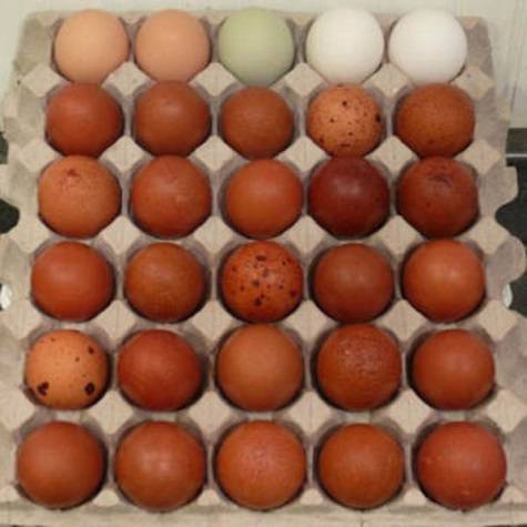 A legfelső sorban lévő fotón fehér tojás található Leghorn-tól, középen Araucan-tól és a Delaware-i csirkéktől balra.
