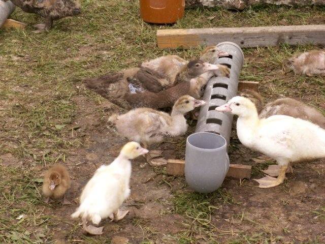 Az etetőknek a mulardkacsák hátsó részének magasságában kell lenniük. Minden ételtípusnak rendelkeznie kell saját adagolóval: nedves péphez, ásványi és vitamin-kiegészítőkhöz, száraz ételekhez, gyógynövényekhez. A vályú kiválasztásakor fontos feltétel a mosás és fertőtlenítés kényelme.
