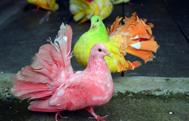 Valódi rózsaszín galambot nem láthat majd valahol az utcán. Azokat a rózsaszín madarakat, amelyek egy nagyváros terein és parkjain találhatók, mesterségesen festenek ebben a színben emberi szeszély kedvéért étkezési színezékkel vagy kálium-permanganát oldattal. Leggyakrabban ezek a pávagalambok, mert gyönyörű farok tollazatukkal nagyon hatásosnak tűnnek.