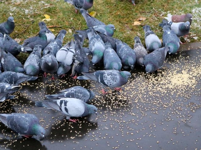 Meg kell jegyezni, hogy a madarak hajlamosak először nagy darabokat megenni, méretük szerint értékelve az ételt. Ne habozzon kiragadni egy darabot, ellökve a hozzátartozókat és lesüllyedve fentről. Az etetés során csak párjukhoz viszonyítva viselkednek tisztességesen. A szürke galambok főként reggel és nappal táplálkoznak, egyenként 17–40 g szemcsét fogyasztanak. Ha lehetséges, a városi galamb a gyomrát élelemig tölti a határig, majd a golyvát a tartalékhoz, ahogyan a hörcsögök teszik.