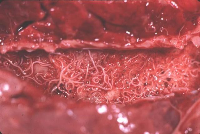 Mivel a gasztrointesztinális traktusból és a mesenteriumból származó lárvák "utat törtek" a tüdőbe, károsították a bélfalakat is. Emiatt pont vérzések is láthatók ott: a lárvák kilépési helyei az állandó lakóhelyükre történő "utazás" idején.