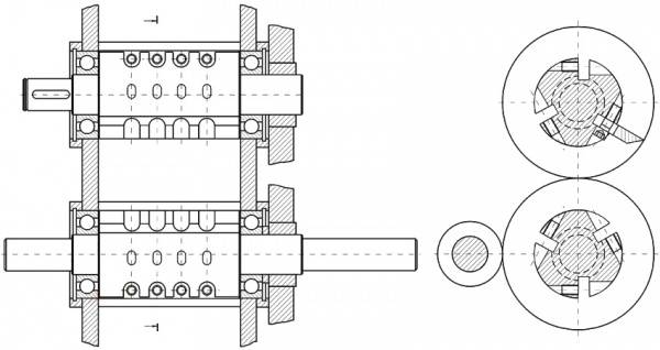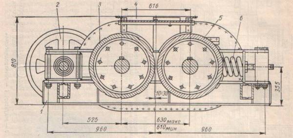 Az ikerhenger aprító is könnyen előállítható. Ezt a bemutatott rajz segítségével ellenőrizhetjük. A aprító két tengelyből áll, amelyekre felülről acélkések vannak rögzítve. Házi készítéskor teherautó rugókból készülnek, és 3-4 darabba kerülnek.A tengely tengelyei és a csapágyak egymással párhuzamosan vannak rögzítve, így a kések forgás közben nem tapadnak meg.