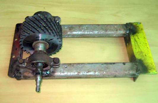 A kéttekercses kerti aprítógép összegyűjtése kerettel kezdődik. Először egy téglalap alakú szerkezetet hegesztenek. A kereten belül négy tengely rögzítő van hegesztve az oldalsó tagokhoz. Úgy vannak elhelyezve, hogy a vágódobok egy vonalba kerüljenek.