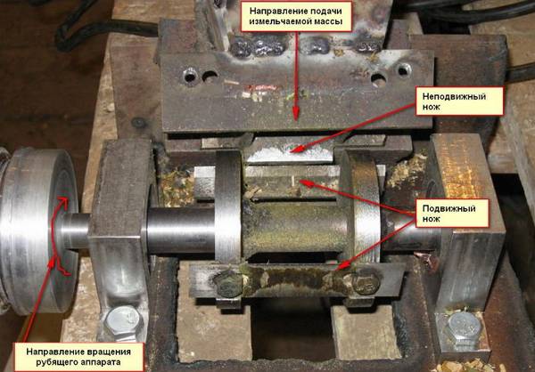 A aprító 3-5 mm vastag acéllemezből készül. 4 lemezt vágnak ki a korongon darálóval. Ezután elvesznek egy darab autórugót, megélesítik és 2 lyukat fúrnak. Van 4 ilyen kés is, amelyek után behelyezik a tárcsa nyílásaiba és megcsavarozzák. A lemez közepén lyukat fúrnak. A tengely menetes végét beillesztik, majd egy anyával erősen meghúzza. Maga a csapágyakkal ellátott tengely a kerethez van rögzítve, a másik végére pedig egy tárcsa kerül.
