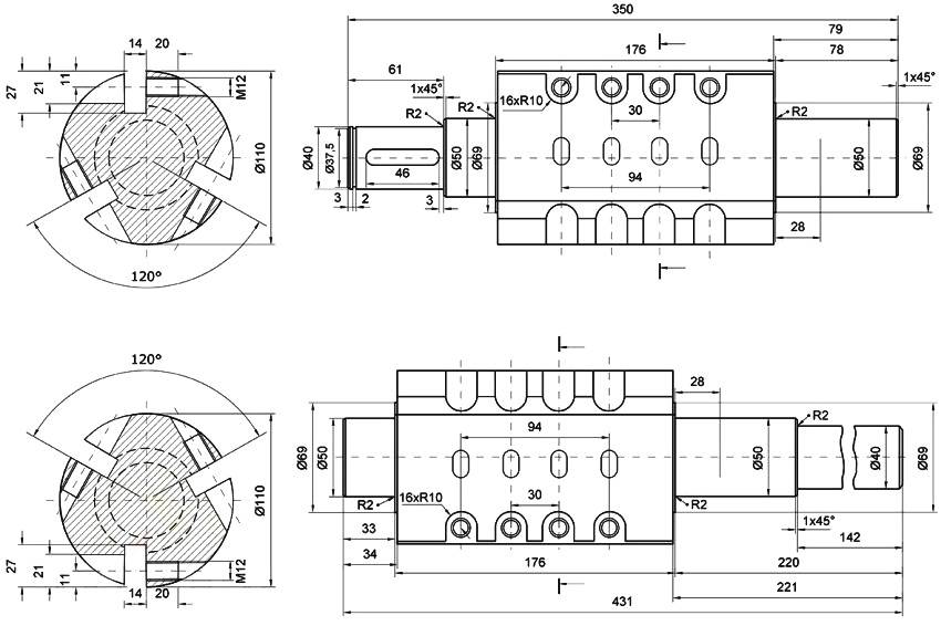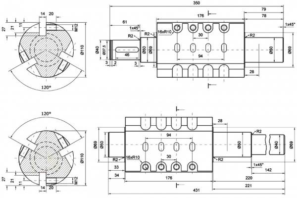 Továbbá a bemutatott séma szerint 2 tengely készül vágódobokkal. Három kés esetén kerek üreset kell találnia. Acél négyzetet használnak 4 késhez. Mindenesetre a tengelyek élei kerek formában vannak kihegyezve a csapágyak számára.