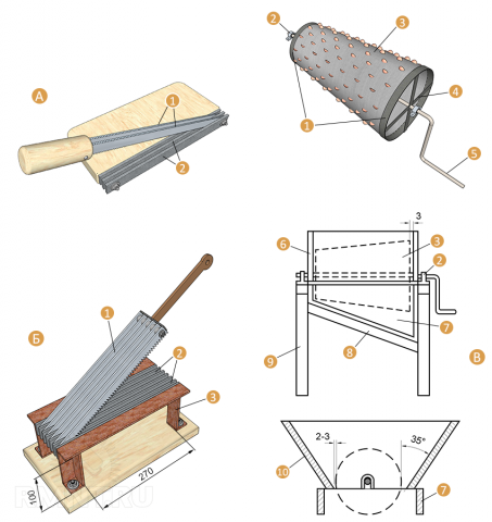 A lágy szerves anyagok aprítói általában hajtás nélkül is működhetnek. Egy személy a keze erejével cselekvésbe hozza őket. Az ilyen mechanizmusok lehetőségeit a fotó mutatja.