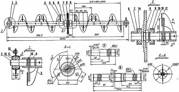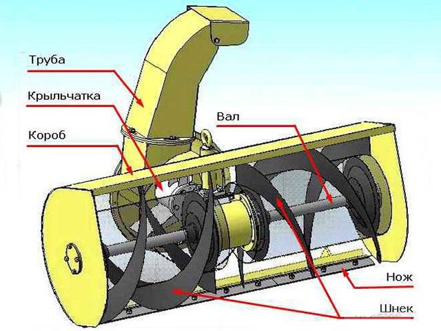A hófúvó teste könnyen elkészíthető. Bármely lemezből hajlik. Az oldalakat akár vastag rétegelt lemezből is lehet vágni. Az agyak középen csavarozva vannak. A csigatengelyre szerelt csapágyak ide kerülnek. Magát a dobot nehezebb késsel elkészíteni. A fotón azt javasoljuk, hogy saját kezűleg tekintse meg a hátsó traktor hófúvójának rajzait, vagy pontosabban magát a csigát.