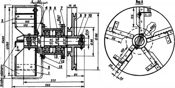 A diagram azt mutatja, hogy a rotor egy tengelyszerkezet, amelyre két csapágy van felszerelve. A járókerék lapátos járókerék. Öt van belőlük a rajzon, de tehet kettőt, hármat vagy négy darabot. A nyomaték a traktoron át ékszíjjal ellátott tárcsákon keresztül terjed.