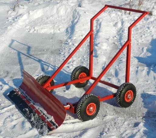 - A kézi buldózer speciális eszköz a hó tisztítására háztartási körülmények között. Mereven hegesztett szerkezet, 4 kerekű, mint a forgóváz. A hófúvó külső végén egy nagy szélességű penge van rögzítve, amelyet a hótakaró vastagságától függően egy vagy másik irányba elforgatva lehet beállítani. A kézi buldózer előnye, hogy a munkavállalónak nem kell állandóan lehajolnia és nehéz lapátot emelnie. Elég csak a mini buldózert maga elé tolni, és egy kupacba lapátolni a havat.
