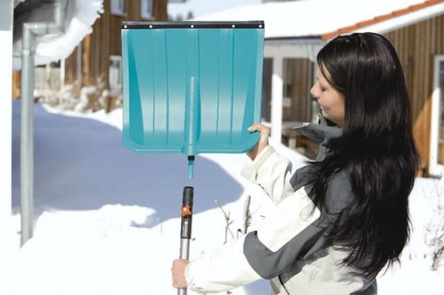 - Műanyag. A műanyag szerszám a legkönnyebb és legkényelmesebb használni. A hó tökéletesen siklik sima felületén, könnyen megfogható és leesik. Még a nedves hó sem tapad a műanyag lapáthoz. A műanyag készlet kiválasztásakor előnyben kell részesítenie a tartós polikarbonátot, amely még az erős rázkódásoknak és fagyoknak is ellenáll -40-ig.0C. Ugyanakkor a polipropilén szerszámokat nem különbözteti meg nagy szilárdság, de viszonylag alacsony költségekkel rendelkeznek. A szélén fém vagy gumi béléssel ellátott műanyag lapátok megbízhatóbbak, jobban képesek eltávolítani a havat a pályákról.