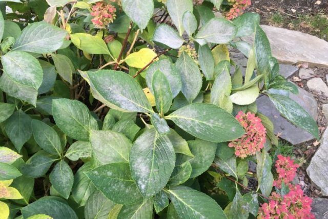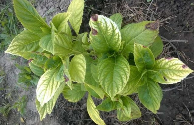 A durva hortenzia leggyakoribb problémája a levélklorózis. Ebben az esetben a lemezek színe sárgára változik, de az erek mindig zöldek maradnak.