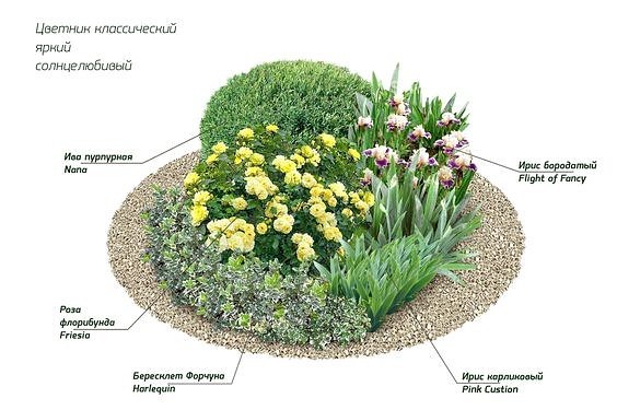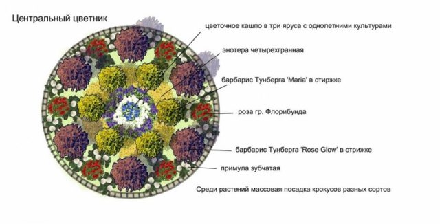 A virágágyás kerek, itt egy ábra a virágok nevével. Az íriszek élénk hangot adnak hozzá. Nem virágoznak túl sokáig, de nyíllevelük fagyig díszíti a virágágyást. És természetesen vannak rózsák.