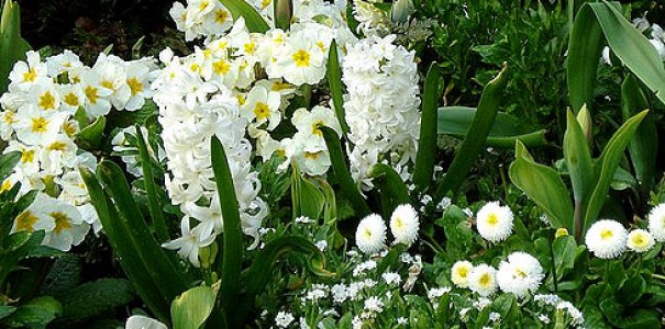 - Monokróm, ahol egy szín van, de a virágok alakja és magassága eltérő (fehér virágágyás, különböző virágokból).