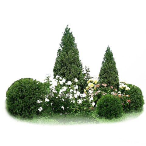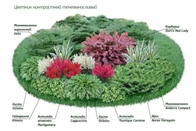 Kerek virágágyás tűlevelűekkel és évelőkkel. Ez a virágoskert gyönyörű, szokatlan lombú növényekből áll. Nemcsak azért jó, mert ellenáll az árnyékolásnak, hanem azért is, mert mindig ugyanabban az állapotban marad. A virágok nem fakulnak ki, itt a hosta, az írisz, a borbolya és más növények levelei felelősek a szépségért. Nem játszik színekkel, de megjelenése nemes, komoly. A virágoskert minden kúriát nagyon méltóan díszít majd.