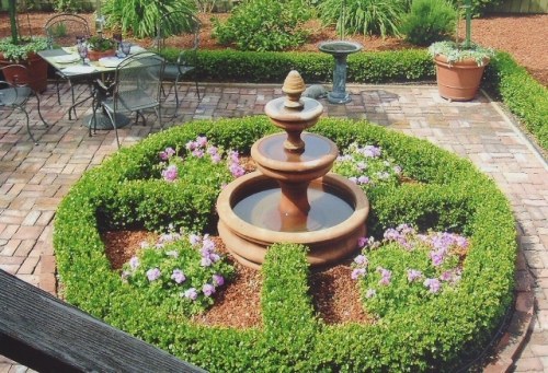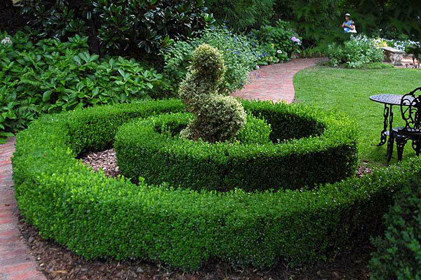- Sövény - a puszpángból vagy más alacsonyan növő cserjékből készült lehetőség elképzelhetetlenül ünnepélyesnek tűnik.