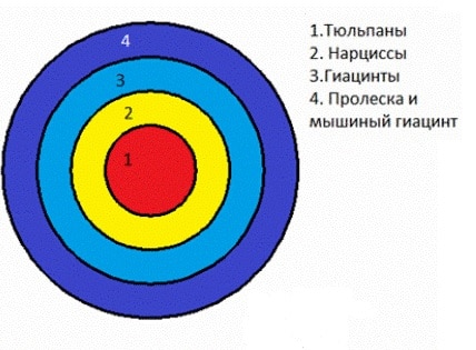 Érdekes ábra hagymás évelők... Kiderül egy kerek magas virágágy. Érdekes, hogy ez a séma a későn virágzó virágok virágágyására "ráhelyezhető".