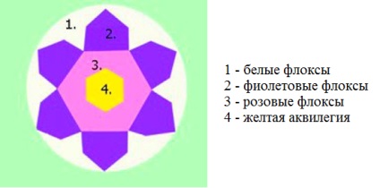 Ez egy virágoskert-diagram, ahol ötféle virágot használnak. A növények ugyanabban a tartományban vannak, és csodálatosan kombinálódnak. Egy ilyen virágágyás figyelemre méltó, mivel itt meglehetősen gyakori virágokat választottak ki, amelyek a hűvös éghajlati övezetekben is könnyen telelnek.