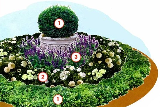 Az évelő virágoskert kerek. Az a séma, ahol a bukszus fényűzőnek tűnik (1) egy virágcserépben. 3. szám - levendula, 2 - rózsa, 1 - sedum.
