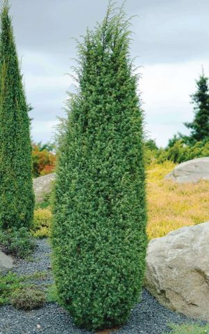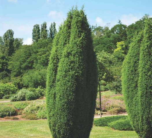 A tájtervezésben a különböző formák kombinációja érdekesnek tűnik - a közös Hibernik függőlegesen növekvő borókája és a vízszintesen kúszó Variegat.