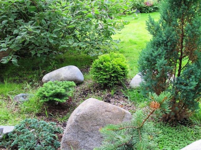Fotó borókának a kertben történő felhasználásáról tűlevelű virágágyás díszítésére.