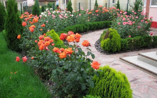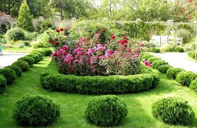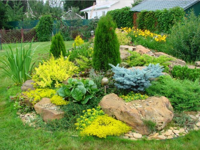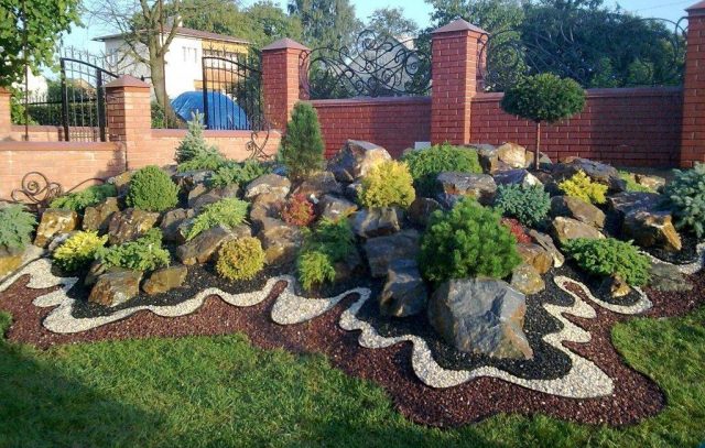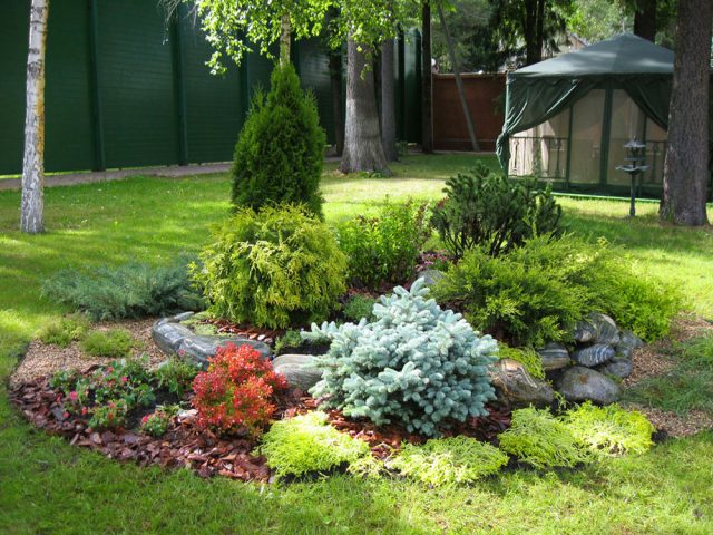 Fotó egy virágágyásról, amelynek megtervezéséhez a thuja több fajtáját alkalmazták.