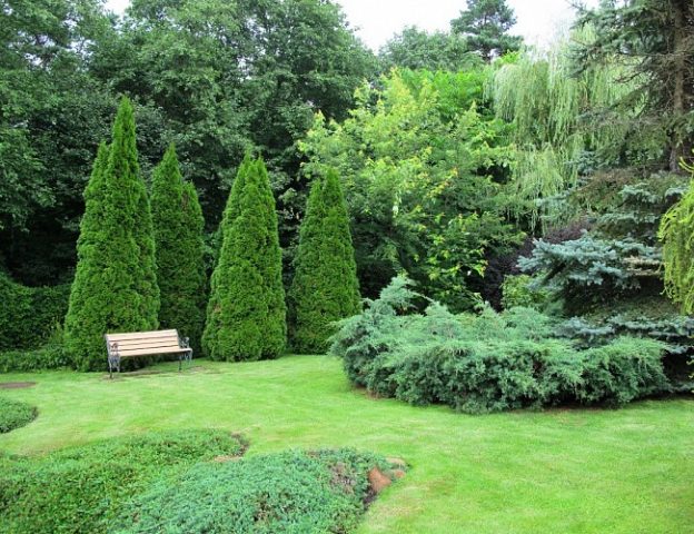 Fotó a tájtervezésről angol stílusban thuja és többféle boróka felhasználásával.