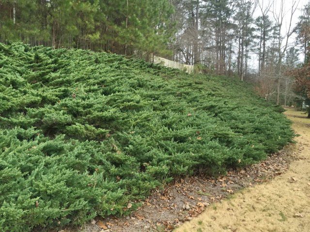 Fotó egy kúszó borókáról a tájon (virágágyon és domboldalon - mint egy talajtakaró növény).
