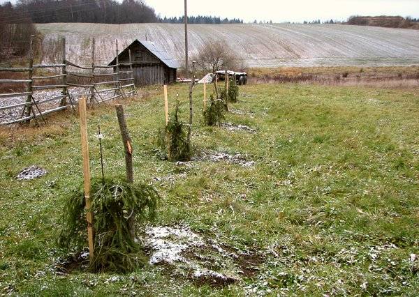- A fa törzsét szigetelni kell (zsákvászonnal megkötve). A gyümölcsfa tövében a lucfenyő ágakat sűrű szőnyeggel kell lefektetni, amely megvédi a rágcsálók fagyását és parazitását.