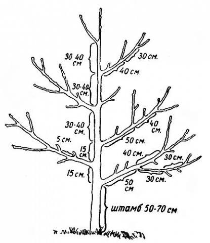 - Az első évben több fő alsó ágat kell körvonalaznia a törzstől 50-60 cm magasságban. A csomagtartótól 80-90 cm fölött lévő összes zöldet el kell távolítani.