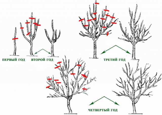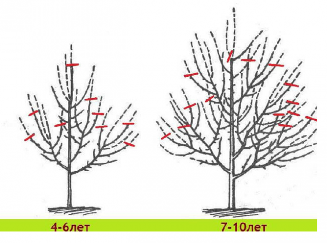 Az alábbi ábra az almafák koronájának kialakulásának néhány általános elvét mutatja be, kortól függően: