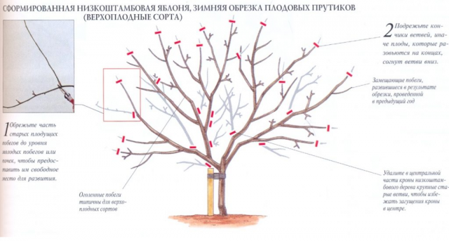 Ezen képződési séma alkalmazásával kényelmes az ágak vágása télen, de a csontváz hajtásait nem lehet erős fagyban lekötni. Ebben az esetben nagy a valószínűsége a törékeny hajtások törésének.