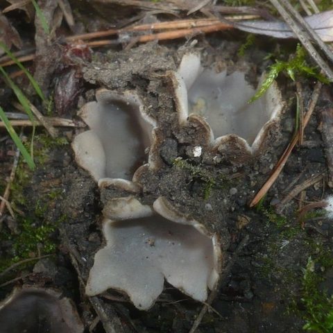 A gomba belső felülete sima, árnyalata világosszürkétől okkerig változhat. A termőtest külsején rövid hullámos villák találhatók, amelyek végén gyakran elágaznak. Ezért a felszínre érve homokszemek és növényi törmelék marad meg bennük. A gomba felett sárgásbarna.