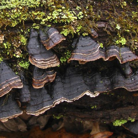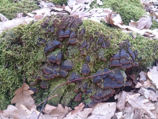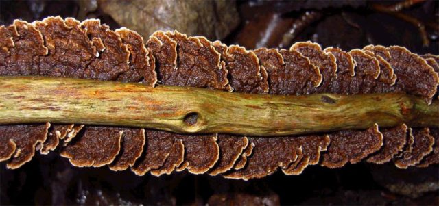 Ha a micélium egy álló csonkon van, a gomba egy leeresztett legyezőre vagy héjra hasonlít. A kivágott fa alsó oldalán gumiszerűek vannak, sokféle, nem ismétlődő alakkal.