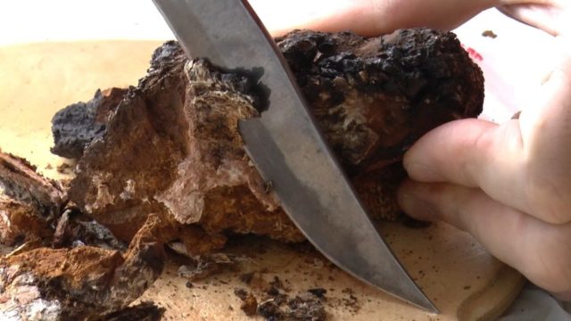 - A megadott idő letelte után a nyírfenék gombát eltávolítják a vízből, és kézzel enyhén összenyomják - szerkezete meglehetősen puha lesz. Az áztatott gombát húsdarálón vezetjük át, turmixgépbe töltjük, vagy egyszerűen kézzel reszeljük le, majd chaga infúzió elkészítéséhez használjuk fel.