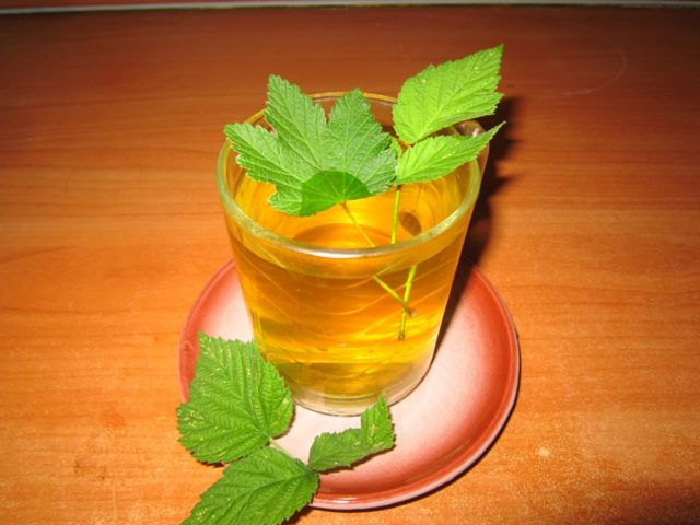 A leveleken kívül málnabokrok szárított virágzatait használják. A leveleket és a virágokat egyenlő arányban vesszük, forrásban lévő vízzel pároljuk, 200 g víz / 10 g nyersanyag sebességgel. Ragaszkodjon 20 percig, és igyon a nap folyamán.