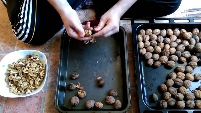 Nehéz ily módon meghámozni a diót, és a magokat épen tartani. Meg kell szokni, hogy kalapáccsal üssék a héjat, hogy ne kerüljön zabkása a héjból és a magból.