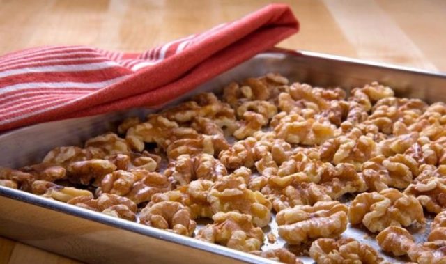 A sütőben sütés egyszerűbb módon - serpenyőben sütve - pótolható. Szükséges a tűz fölött melegíteni, hozzáadni diót. Keverés közben legfeljebb 10 percig sütjük őket. Ezután hagyjuk kihűlni.