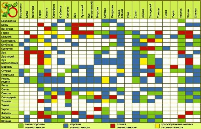 E táblázat használatával megpróbálhat különböző lehetőségeket létrehozni a zöldségek vegyes telepítéséhez. Ha vegyes zöldségültetvényeket használ az egész kertben, akkor még a vetésforgó sem válik annyira relevánssá, mivel a növények telepítésének ez a lehetősége szintén segíthet megszabadulni a betegségek talajban felhalmozódásától.