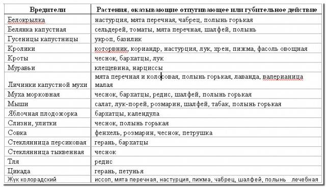 Az alábbi táblázatból megtudhatja, hogy mely növények védenek a kerti növények fő kártevőivel szemben.