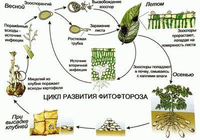Általános szabály, hogy a burgonya az első, amely megbetegedik a késői sértésben. A gomba spórái megtalálhatók az egészséges külsejű maggumókban és a talaj felső rétegében. A beteg burgonyától kezdve a betegség átterjed a paradicsomra is. A burgonyabetegségtől a paradicsombetegségig eltelt idő csak egy hét, legfeljebb tíz nap. A spórák napos időben meghalhatnak. Nedves és hideg nyár éles hőmérséklet-változásokkal és ködökkel járul hozzá a gyors terjedéshez fitoftóra.