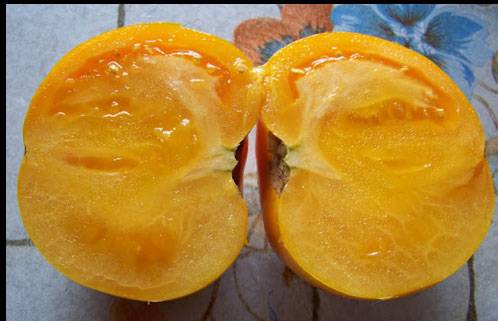Az "Orange" fajta nagy gyümölcsű. Paradicsomja körülbelül 200-300 g, különösen kedvező körülmények között a zöldségek tömege elérheti a 400 g-ot is. A paradicsom pépe nagyon édes és húsos. 3,2% cukrot és viszonylag magas (6,2%) szárazanyagot tartalmaz. Amikor a gyümölcsöt a belső üregbe vágja, 2-3 kamrát láthat, amelyek bizonyos mennyiségű gyümölcslével és maggal vannak feltöltve.