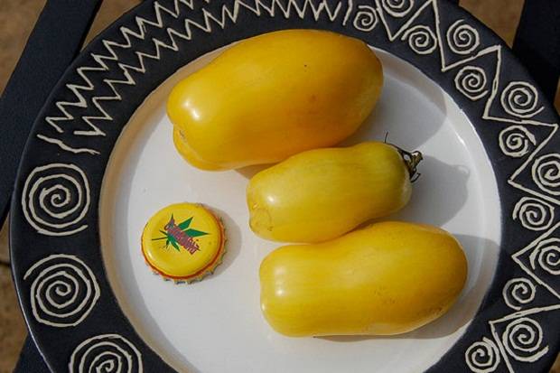 Az élénk sárga szín a Banana Legs paradicsom jellegzetes jellemzője. A kissé éretlen gyümölcsök halványzöld színű apró villanásokkal rendelkeznek, amelyek érésükkor eltűnnek.