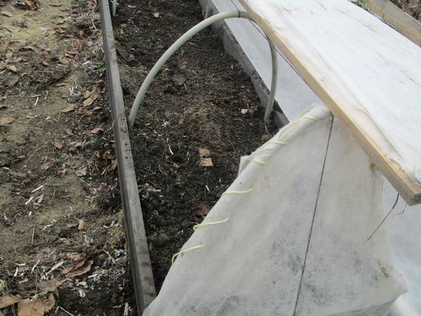 - tavasszal, amint a hó elolvad, eltávolítjuk a humusz egy részét, lefedjük az ágyat nem szőtt anyaggal, és íveket helyezünk el, amelyekre a filmet dobjuk.